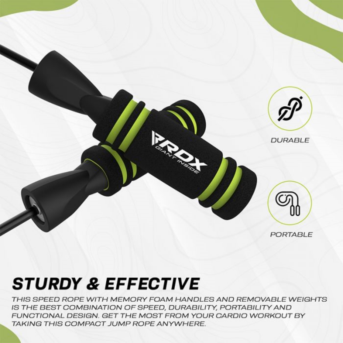 ROBUSTE ET EFFICACE - Cette corde de vitesse avec poignées en mousse à mémoire de forme et poids amovibles est la meilleure combinaison de vitesse, durabilité, portabilité et conception fonctionnelle. Tirez le meilleur parti de votre entraînement cardio en emportant cette corde à sauter compacte partout. La meilleure corde à sauter d'entraînement pour la maison et peut facilement se glisser dans un sac pour être emportée en voyage.
