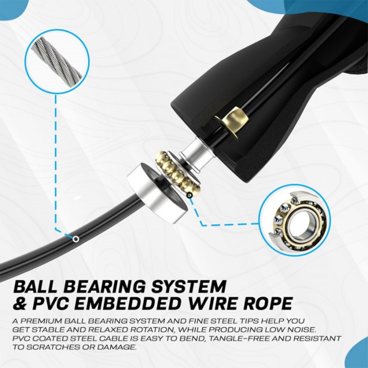 Premium quality PVC coated cable wire is a top choice for skipping rope enthusiasts who are all about speed. The industrial-strength steel cable rotates around users very quickly, helping them build speed without producing much noise. It also prevents kinking, tangling and bending which can mess up the momentum. A protective, double PVC layer ensures the cable is resistant to scratches as well as wear-and-tear due to collision with abrasive surfaces, which makes your jump rope last longer. An ergonomic handle design with environmental friendly memory foam coating provides firm, non-slip grip for focused skipping. The foam quickly removes sweat from hands so you are comfortable for longer and can take full advantage of your cardio workout. Strong PP material handles are also resistant to breakage and durable enough to hold removable weights (6.0oz / 9.5oz) in a special handle compartment. The loaded weight bars add extra resistance to increase intensity of your workouts and burn more calories. Switching over to high speed skipping routines is just as easy – just remove the additional weights from the handlebars to decrease resistance to jumps. A fast-speed ball bearing mechanism, including industrial-strength steel tips, allows the rope to rotate faster, with a smooth and stable swing – without any interruptions.