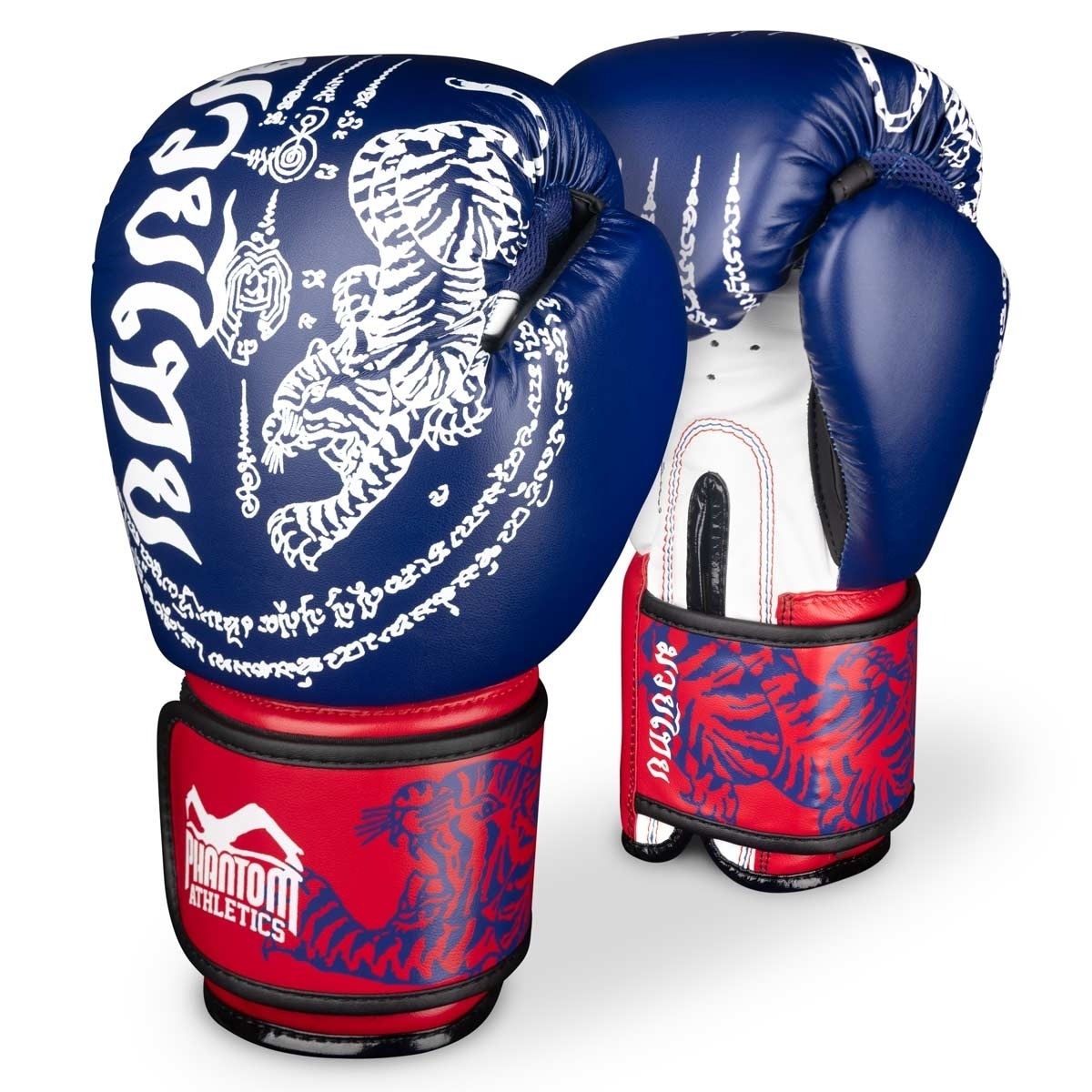 The Phantom Muay Thai boxing gloves with Sak Yant/Yantra artwork (tigers, Thai scripts) are best-sellers for sparring and training. Their high-tech foam absorbs impact, while the compact Thai cut and wide Velcro keep your wrist locked in.