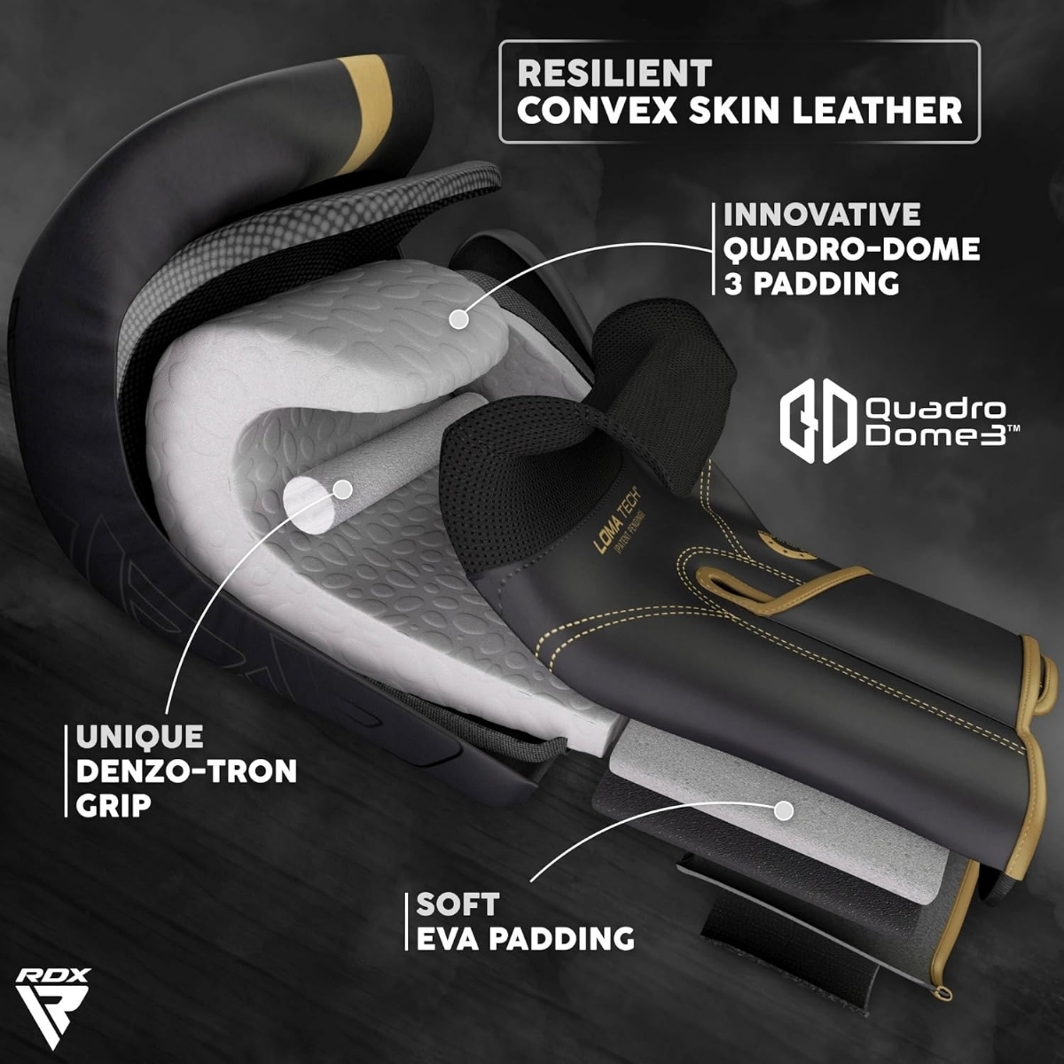 Description Guantoni Boxe RDX F6 Kara – Nero/Oro – 14oz