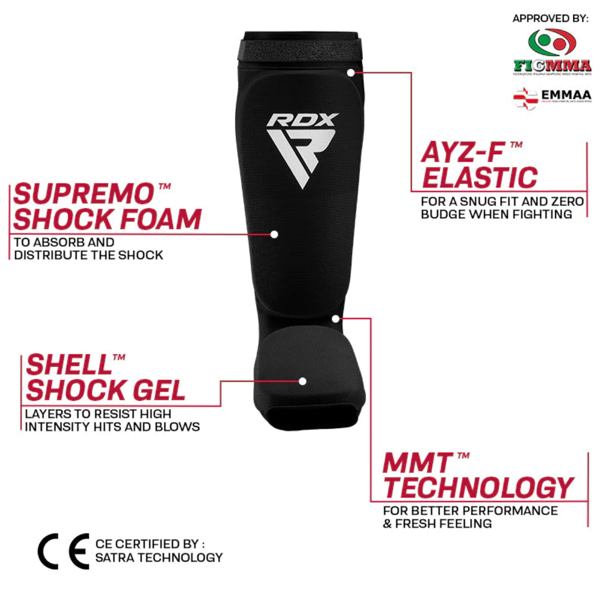 The RDX SIB shin and instep guards have undergone rigorous testing to deliver trusted protection and comfort. Their lightweight construction keeps you mobile, while the layered foam structure disperses impact before it reaches your shin. An integrated gel layer adds extra cushioning, and the moisture-wicking lining keeps skin dry. The Ayz-F™ elastic system ensures a precise, secure fit, giving you agility and confidence during training or sparring.