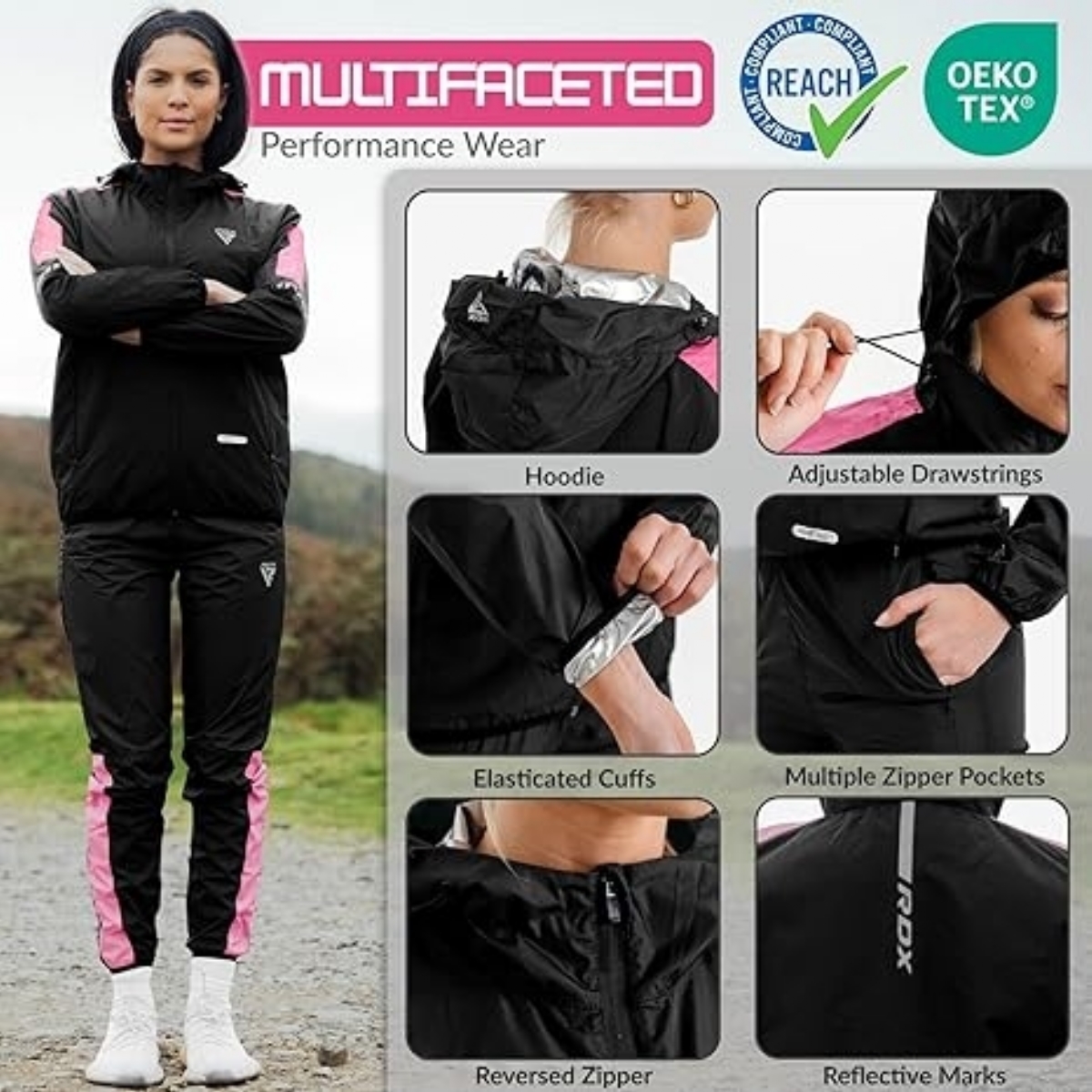Erreiche deine Fitnessziele schneller mit dem RDX H1 Sauna Anzug. Hergestellt aus hochwertigen Materialien und nach europäischen Standards (OEKO TEX-100 REACH) zertifiziert, sorgt dieser Anzug für maximale Effizienz bei jedem Training. Die innovative Heat Suit™ Technologie mit silberner Instant Sweat™ Innenbeschichtung steigert die Schweißproduktion bis zum 5-Fachen. Bewege dich frei, bleib sicher und meistere jedes Workout – von Power-Walks bis zu intensiven HIIT-Einheiten.