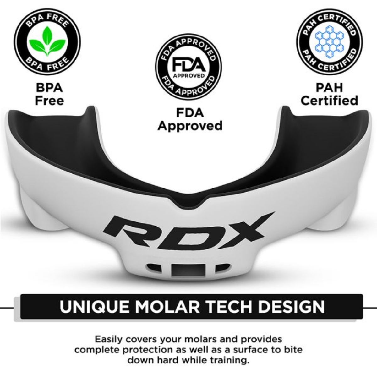 Wenn es darum geht, Ihren Mund zu schützen, müssen Sie sicher sein, dass Ihr Zahnfleischschutz perfekt sitzt - ein Zahnfleischschutz, der keinen Platz für einen Schlag bietet, der ernsthafte Verletzungen verursachen könnte. Der RDX Gel-Mundschutz Gum Shield sorgt dafür, dass Ihre Zähne sicher bleiben, denn er passt sich durch seine Boil-and-Bite-Konstruktion genau der Form Ihrer Zähne an. Er ist mit der Shell-Shock™-Technologie ausgestattet, die Stöße effizient absorbiert, und Molar Tech™ bietet eine zusätzliche Schutzschicht für die wertvollen Backenzähne. Also, machen Sie sich bereit für den Kampfmodus, denn wir sind hier, um Ihr Lächeln zu schützen, egal wie hart das Spiel ist!