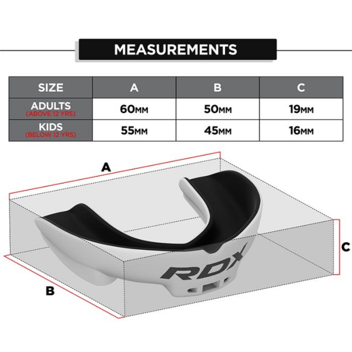 Der RDX Zahnschutz für Erwachsene in Schwarz und Weiss wurde für einen sicheren und bequemen Sitz beim Training und Wettkampf entwickelt. Das Boil-and-Bite-System ermöglicht eine individuelle Anpassung an die Zahnform.