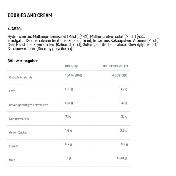 Hydrolyzed whey protein isolate(milk) (47%), whey protein isolate(milk) (43%), low-fat cocoa powder, emulsifier (sunflower lecithin, soya lecithin), salt, flavoring, flavoring agent (potassium chloride), sweetener (sucralose).